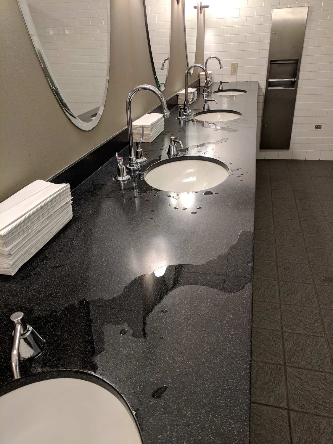 The washroom has in-the-wall towel + trash stations at each end of the counter, but they’re obviously inadequate for the purpose. Fortunately, the counters slope away from the attractive stacks of paper towels.