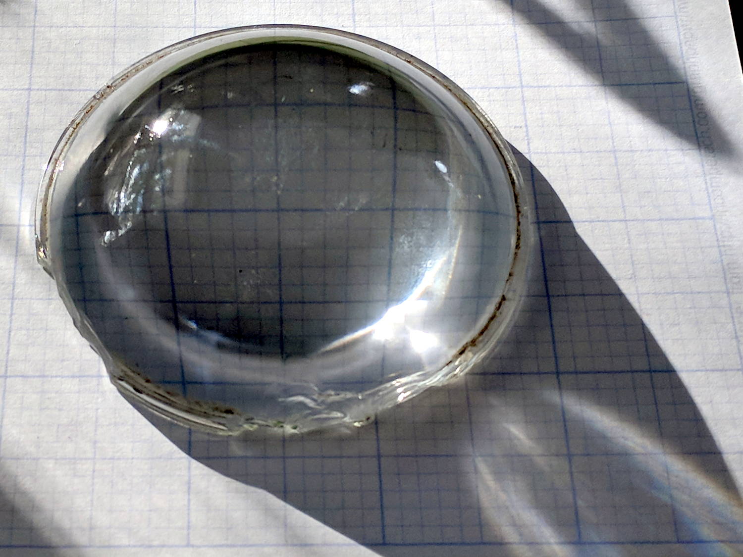 I’m not quite sure what to do with a chipped condenser lens, so it’s sitting on the windowsill (in a sun-safe orientation) along with many other glittery bits of glass I’ve collected over the years.