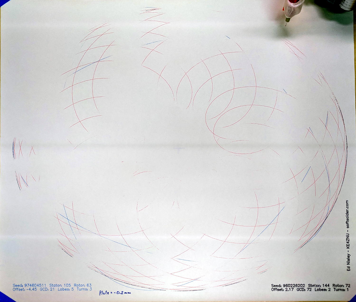 With the plot at Z=-0.2, the legends toward the front came out OK, but they’re missing along the far edge. The Spirograph traces go completely missing toward the left rear as the pen rises away from the paper, although I think we’re also seeing some ripples in the paper sheet.