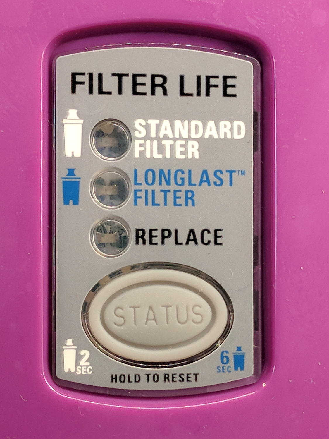 The new pitcher includes a different indicator with green LED status blinkies for “Standard” (40 gallon) and “Longlast” (120 gallon) filter cartridges and a red blinkie for “Expired”: