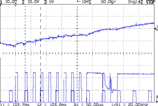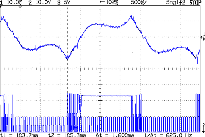 The taller waveform along the bottom of the first scope shot comes from the H bridge output tending to increase the current waveform, so it’s applying a solid +24 during the flat top section and not only gets no traction, but actually loses ground just after the middle of the screen. Eventually the back EMF drops and the current begins increasing, but long after what should be the 600 mA peak current where the driver flips the H bridge and begins trying to decrease the current.