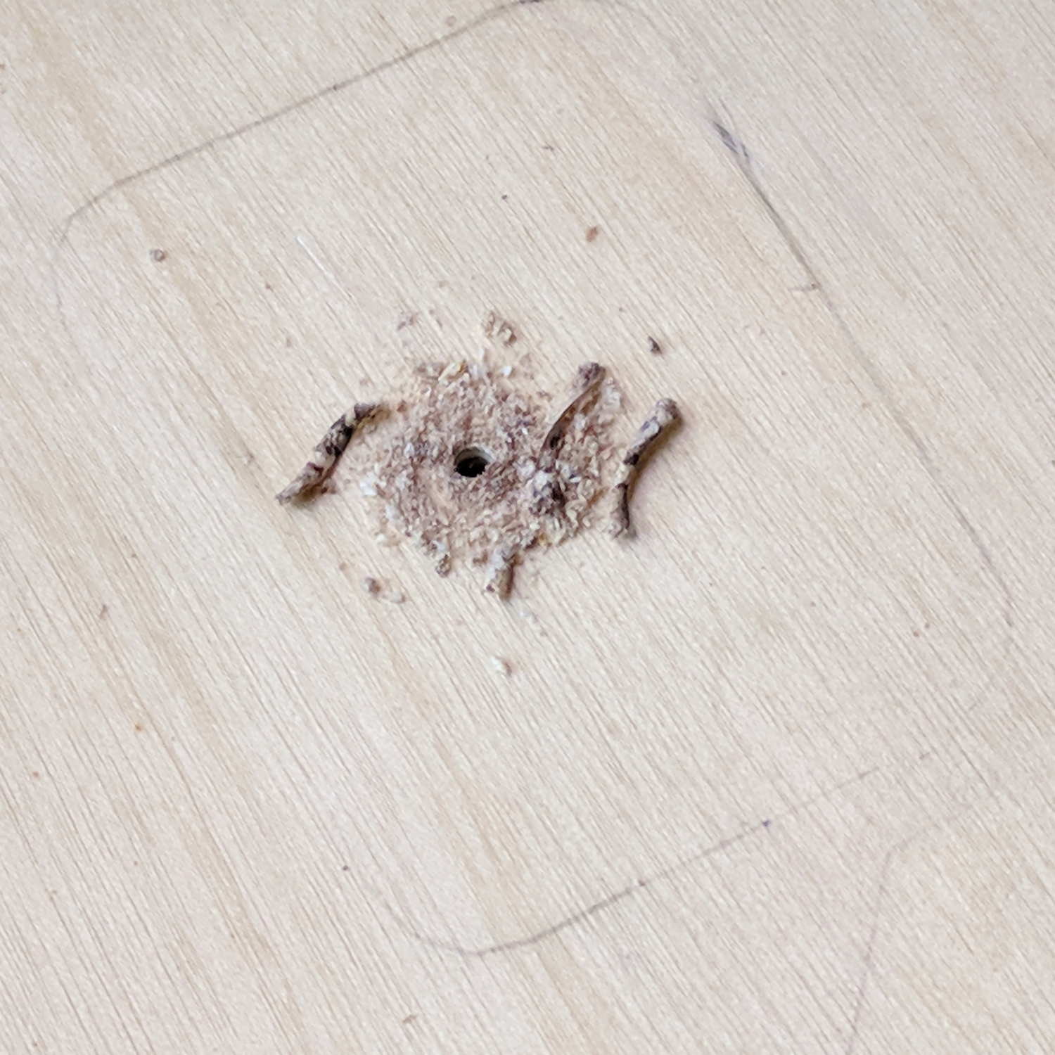 By complete coincidence, the rear bolt holes turned out to be exactly lined up with the edge of the metal bench frame, so I had to remove eleven of the twelve screws holding the bench to the frame, rotate it slightly, drill the rear holes, install the t-nuts, un-rotate the top, and reinstall all the screws. As it turns out, the four end screws are located in blind parts of the frame where I could remove three of them, but cannot re-install them with any tool at my command. I think I can conjure a modified finger wrench, but …