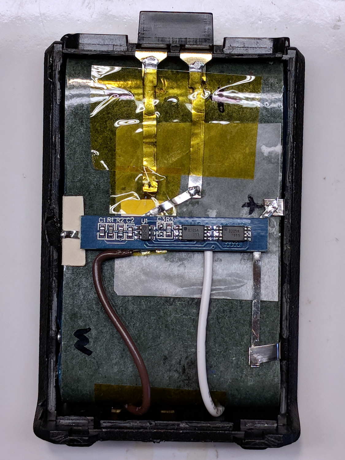 The 18650 cell protection PCBs with 8205 ICs arrived and seemed small enough to simply tuck into the gap between the rounded cells in the second Baofeng BL-5 pack: