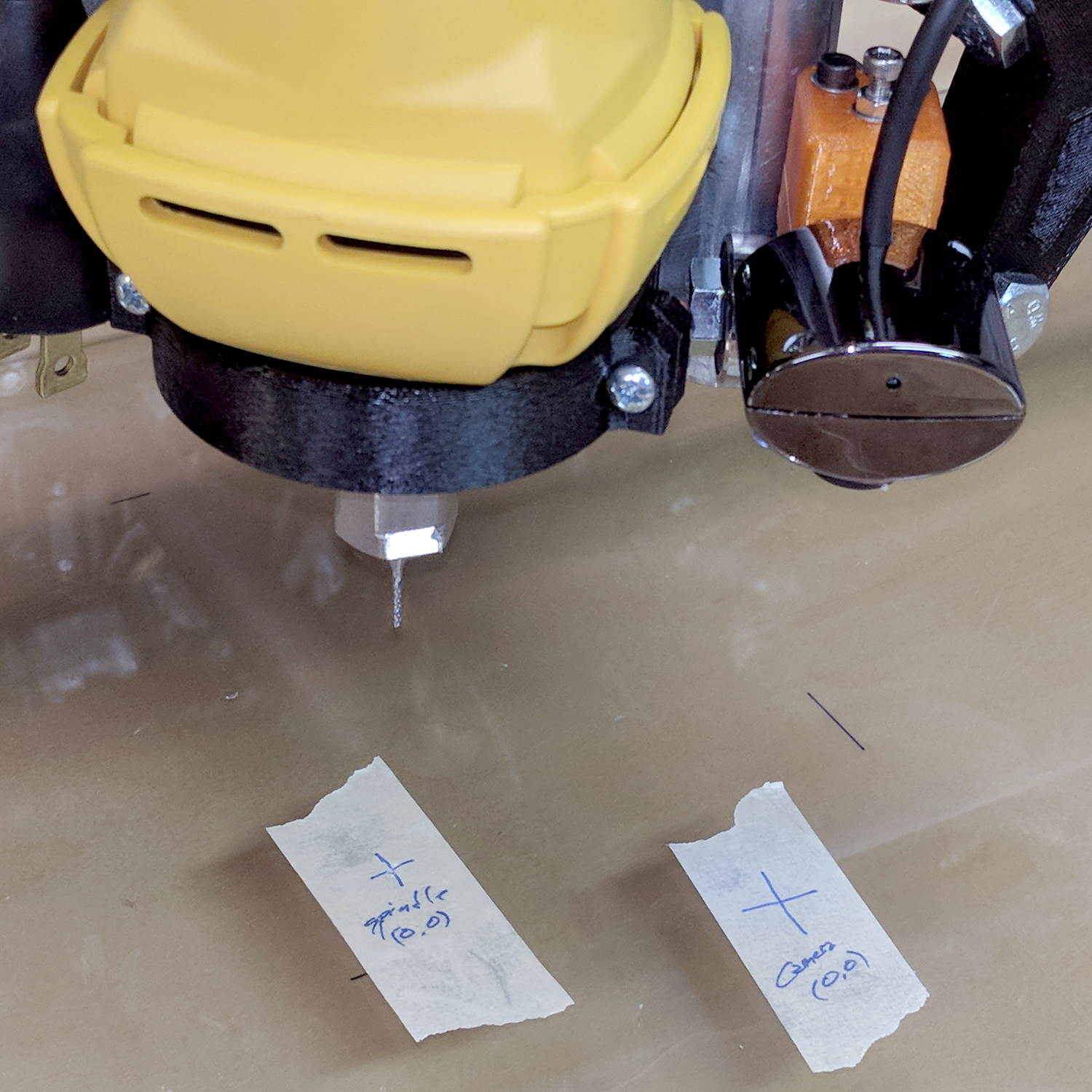 Then mark the spot directly under the spindle, perhaps by poking a small cutter into the tape, measure the XY distances between the two center points, and use bCNC’s camera registration process to set the camera offset.