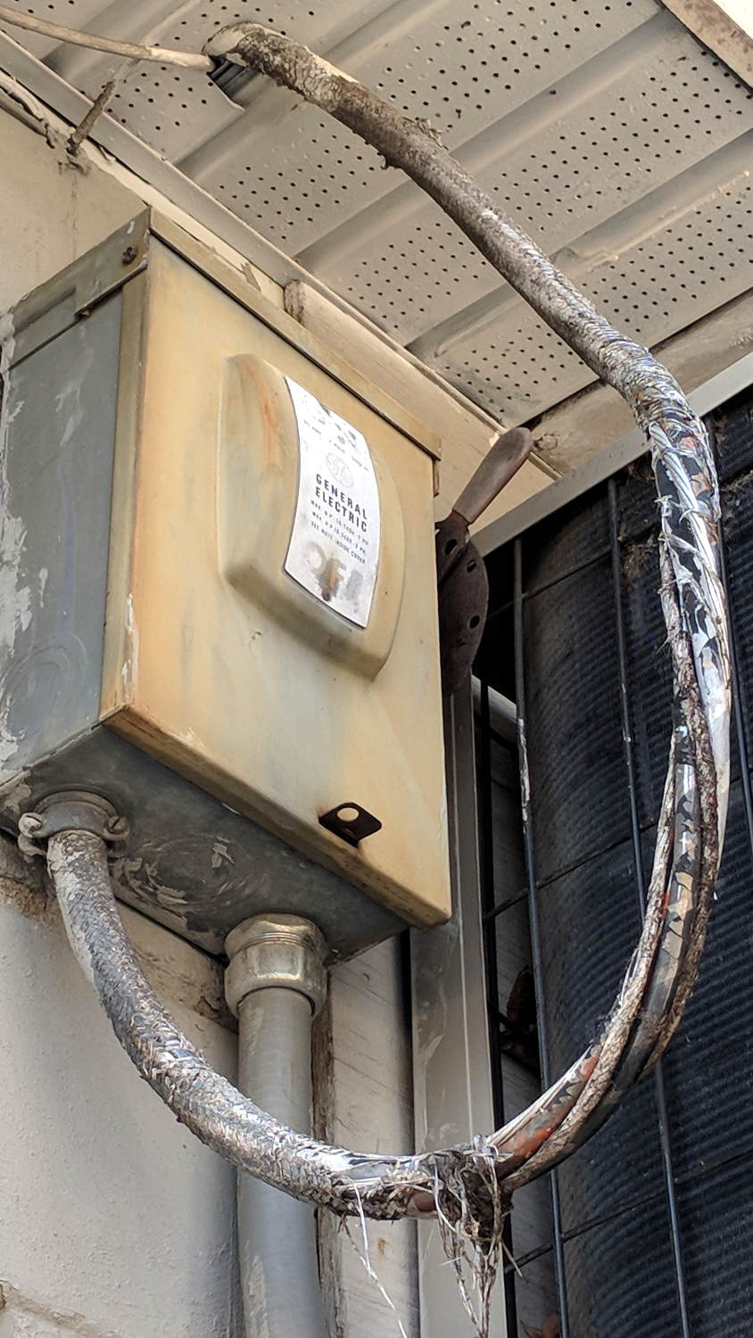 The long term effect of MIdwestern weather on electrical components is the main reason why I have no fear of a robot apocalypse. That bit of cabling probably gets direct sun in the summer (I’d guess that the part near the top where the cable is less ravelled is where the shadow of the room generally falls) ice buildup in the winter, and rain the time. Dealing with exterior, rooftop mounted parking lot lights on a regular basis, I am convinced that ten years is about the outside lifespan of any conduit left exposed to the elements.