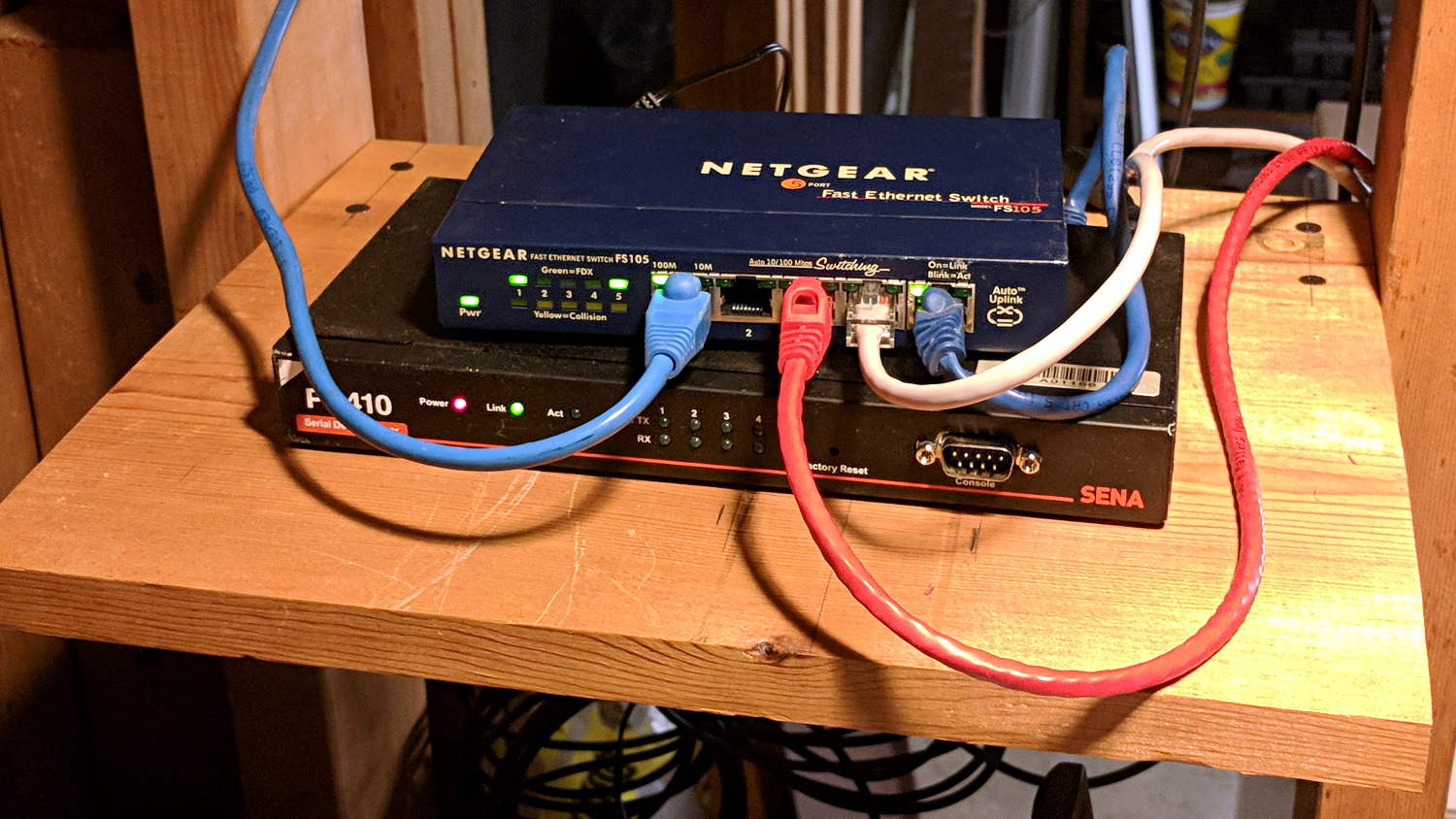 A crude shelf bandsawed from a plank moves the Sena PS410 serial server and an old Ethernet switch off the bench:
