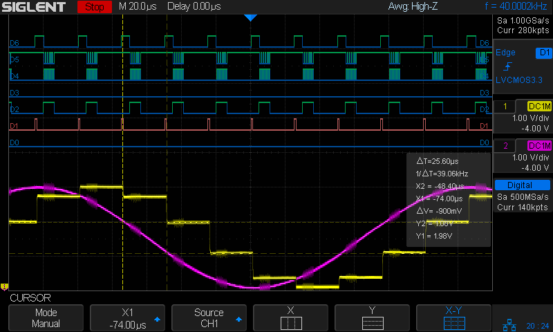 The pulses in D1 (orange digital) mark timer ticks at a 40 kHz pace, grossly oversampling the 4 kHz audio bandwidth in the hope of trivializing the antialiasing filters. The timer tick raises the DDS latch pin (D6, top trace) to change the DDS frequency, fires off another ADC conversion, and (for now) copies the previous ADC value to the DAC output: