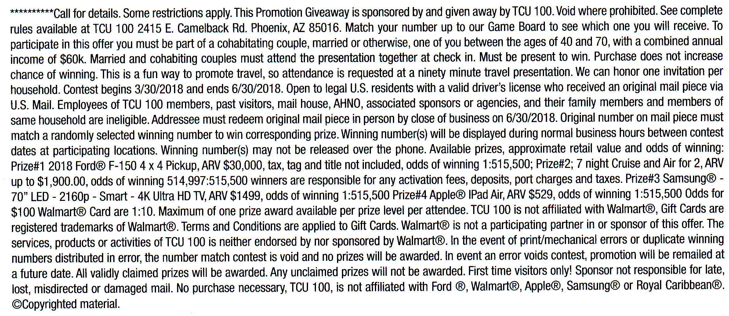The copious fine print says you can only see the actual fine print by traveling to Arizona: