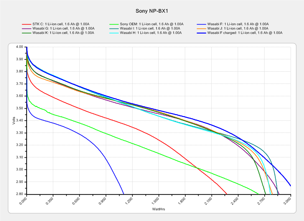 The very short blue trace is the Wasabi F battery after a ride, showing about 1 W·h remaining of the initial charge. After a full change, the upper blue trace shows it has a capacity in the same range as the others. Our rides are about an hour long, so the camera draws somewhat less than the 1 A test current, roughly what I’d estimated from other data.