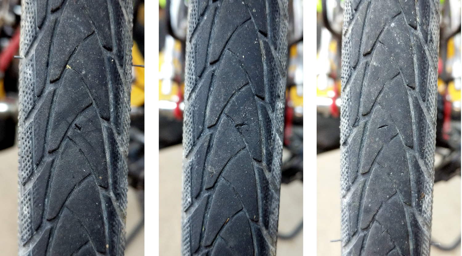 With the bike up on the stand, I didn’t spot the expected large glass chip or sharp wire, but I did find three smaller gashes: