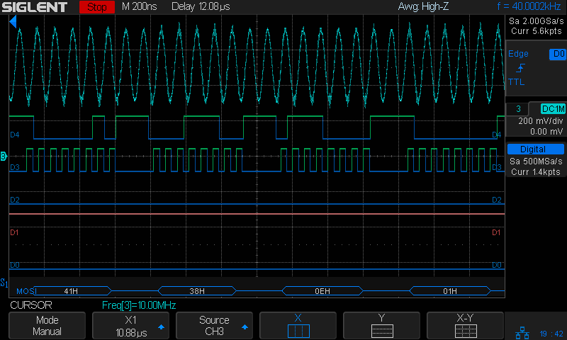 Poking the Print button on the front of the Siglent SDS2304X scope saves the screen to a BMP file (in the /BMP directory) on a USB flash drive plugged into its front-panel port: