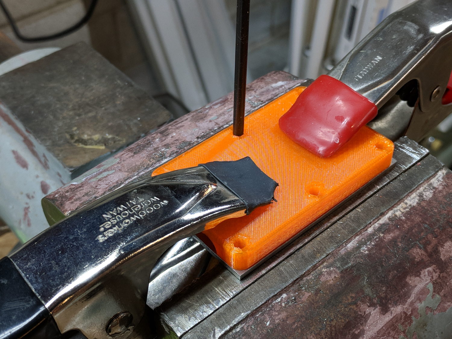 Some drill press action with a slightly oversize drill compensated for any misalignment and Mr Disk Sander rounded the corners to match the plastic block: