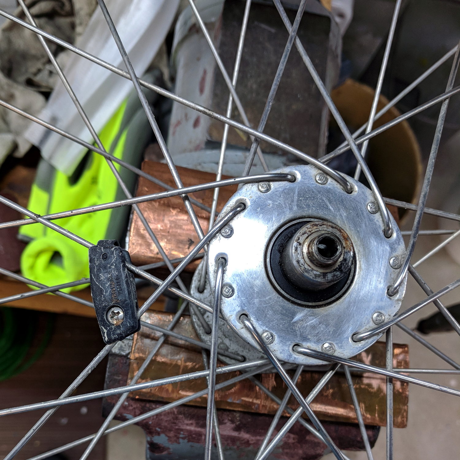 For future reference, the rebuilt wheel spoke tensions came out around 25, slightly lower than the 27-ish I measured on Mary’s bike; it didn’t occur to me to measure the tension until after I’d relaxed the spokes. I’ll ride it for a while before doing any tweakage.