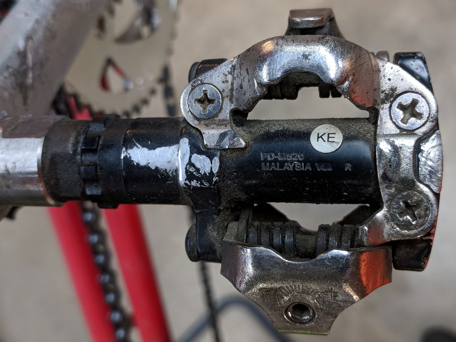 Long ago, I put Shimano PD-M324 pedals on Mary’s Tour Easy, because she prefers a pedal with a platform on one side and SPD cleats on the other.