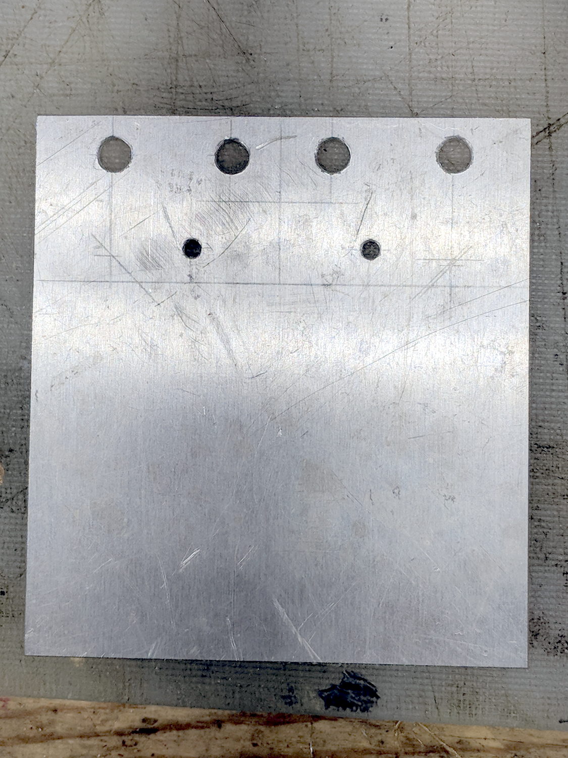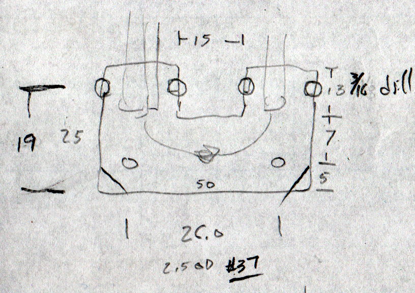 The four holes beside the tabs will serve as starting points for rectangular notches holding cable ties lashing the wires to the plate: