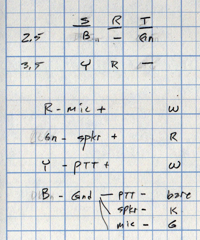 The wire colors from the dual plug, along with the wire colors for the repurposed USB cable to the headset, and the PTT connection: