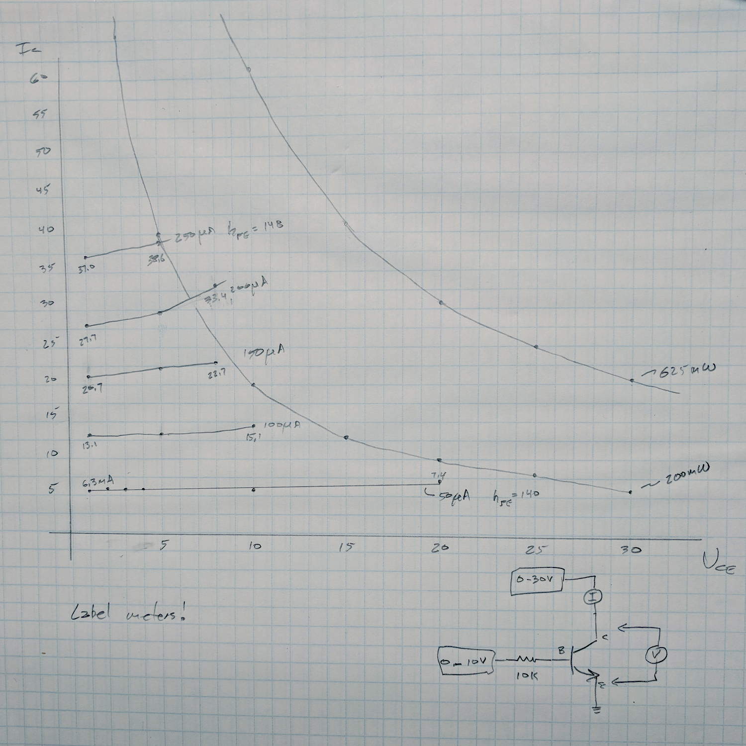 With data in hand, we carefully increased the collector voltage with constant base current, ventured slowly into the non-SOA, and eventually measured the same base current producing no collector current at all. No smoke, much to the disappointment of all parties.