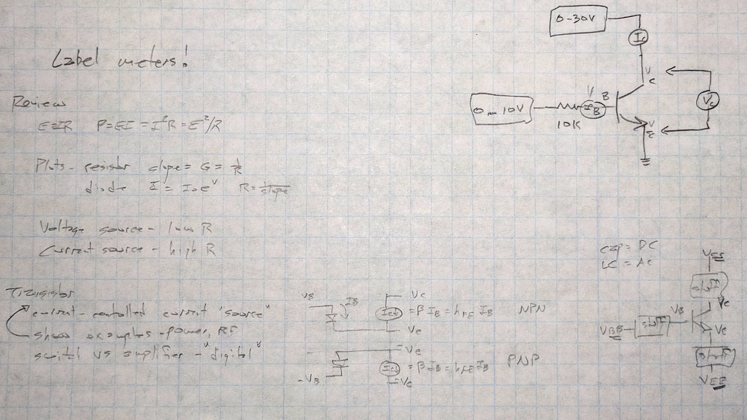 We finally talk about (bipolar, NPN) transistors as current-controlled current sources / sinks, ruthlessly restricted to DC operating conditions.