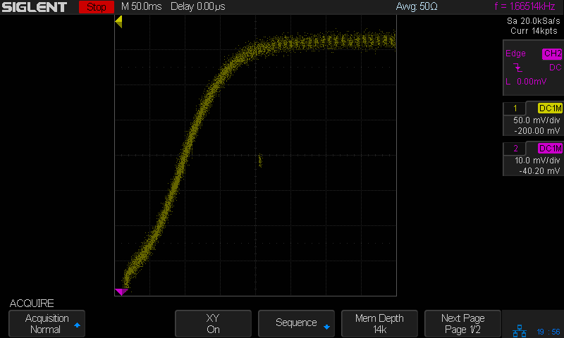 Seen a bit closer to the origin, with a fixed 100 μA base current and the scope’s arbitrary function generator producing a voltage ramp: