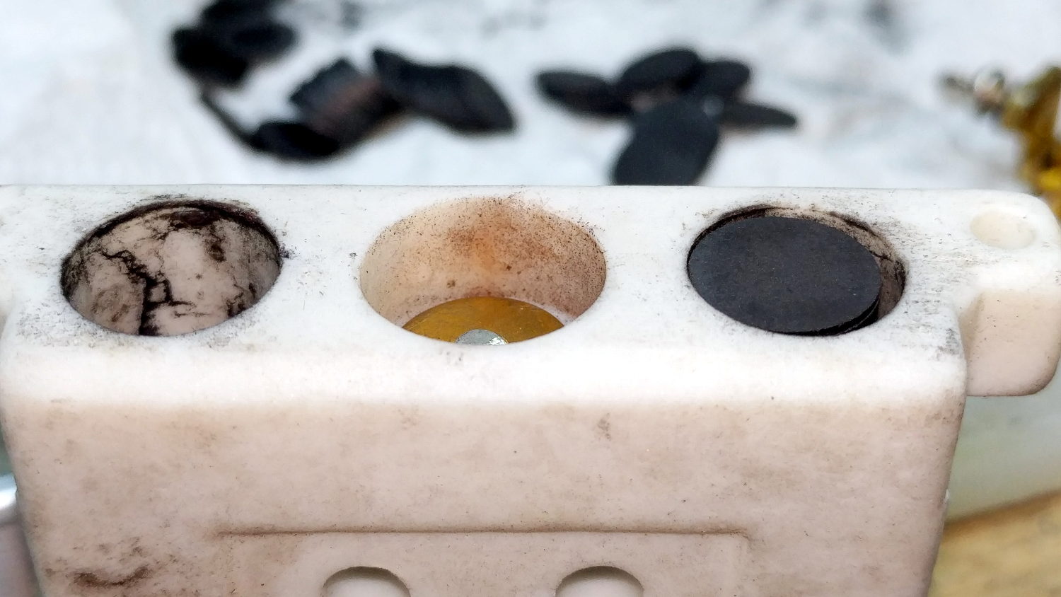 Most of the deterioration happens within half a dozen disks snuggled up against those contacts, a few more on the other end of the stack against the graphite button applying the pressure, and an occasional grimy disk in the middle of the stack.