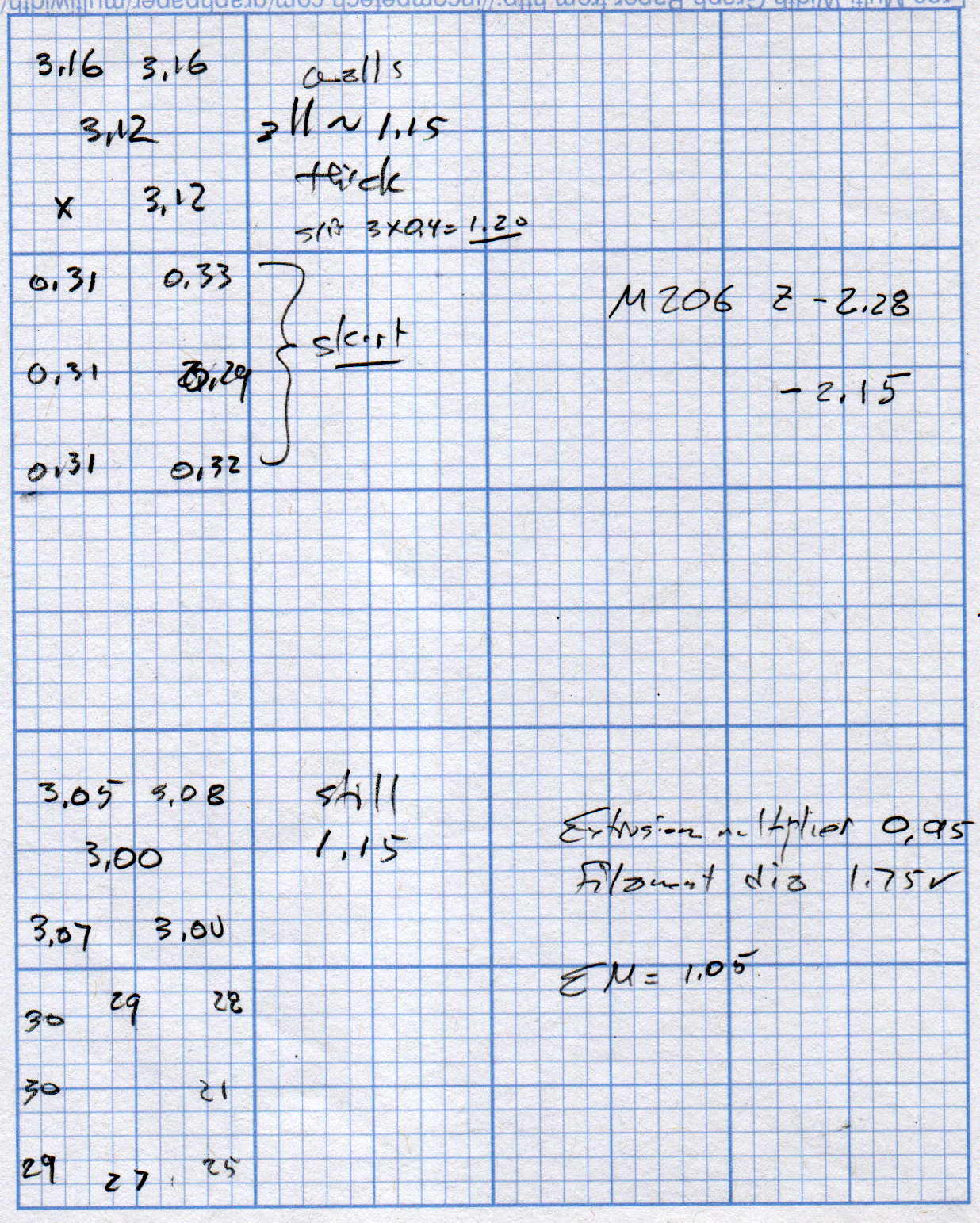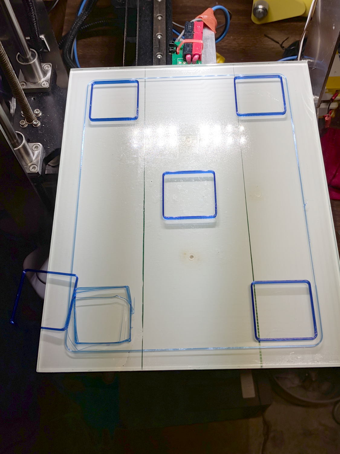 The walls are also thin by a smidge, but the first order of business is to reset the Z offset with M206 Z=-2.15. With that in hand, the second set of squares came out at 3.00 to 3.08 mm (lower left numbers), which I defined to be Close Enough.