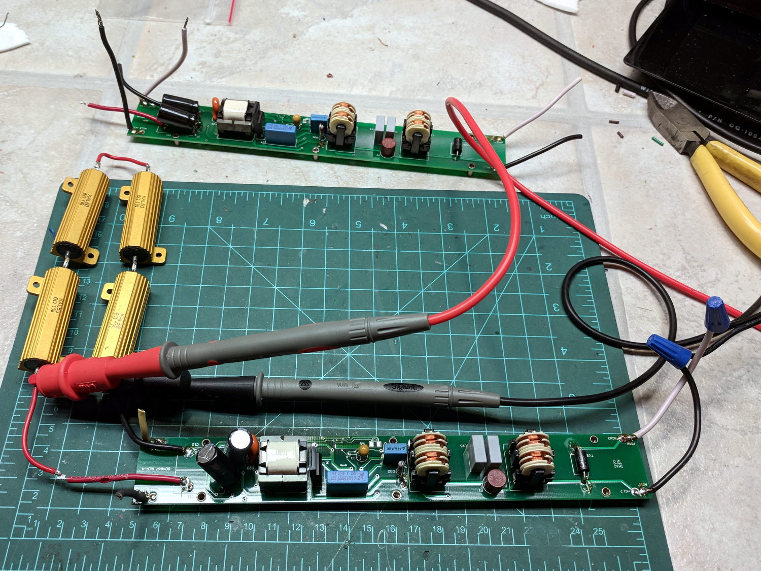 The working panels showed the power supplies produced about 19 V across two parallel strings of six LEDs, with each string running at 350 mA for a total of 700 mA = 13 W. I wired up a quartet of 6 Ω power resistors to check out the power supplies from the suspect panels:
