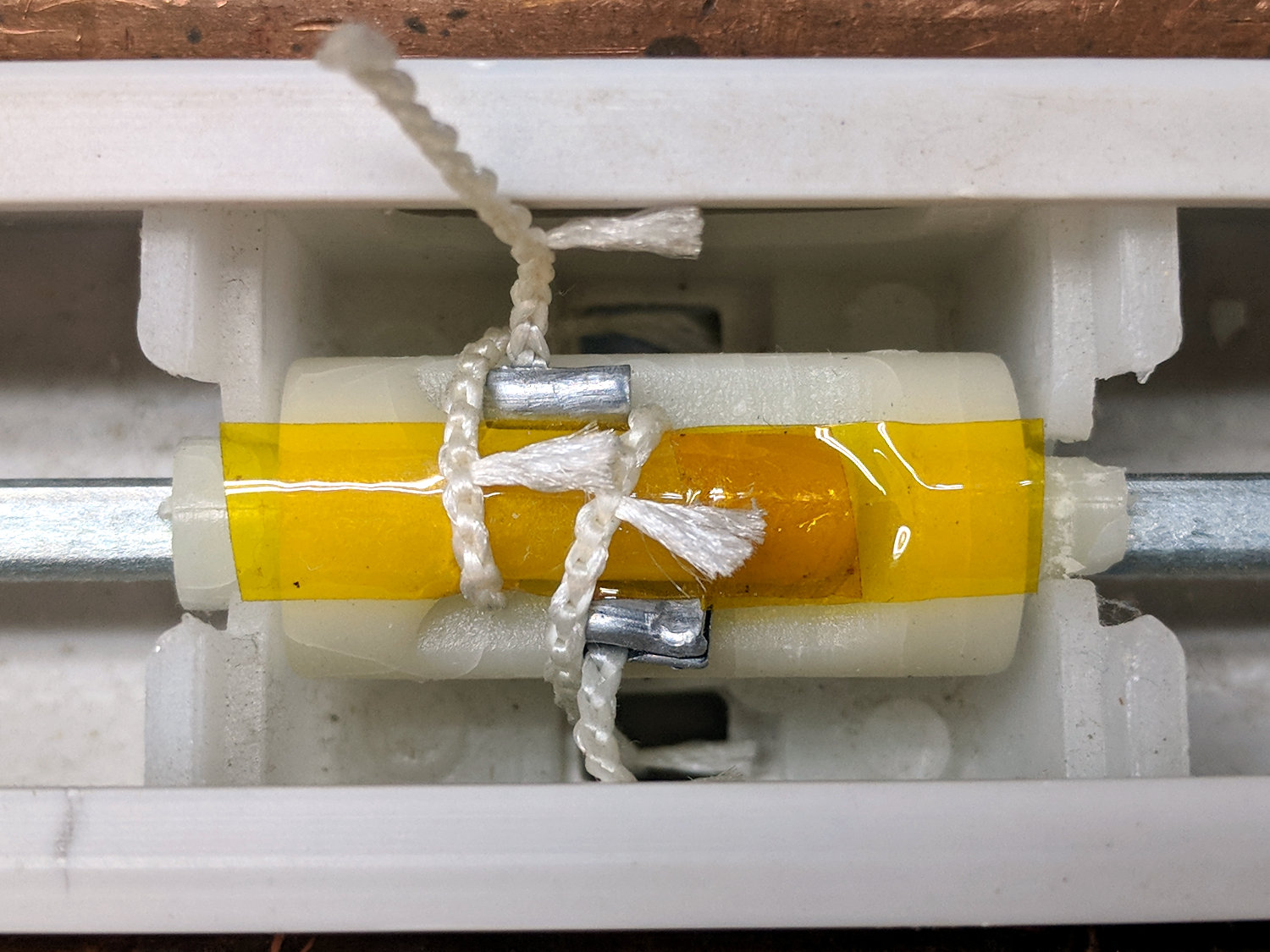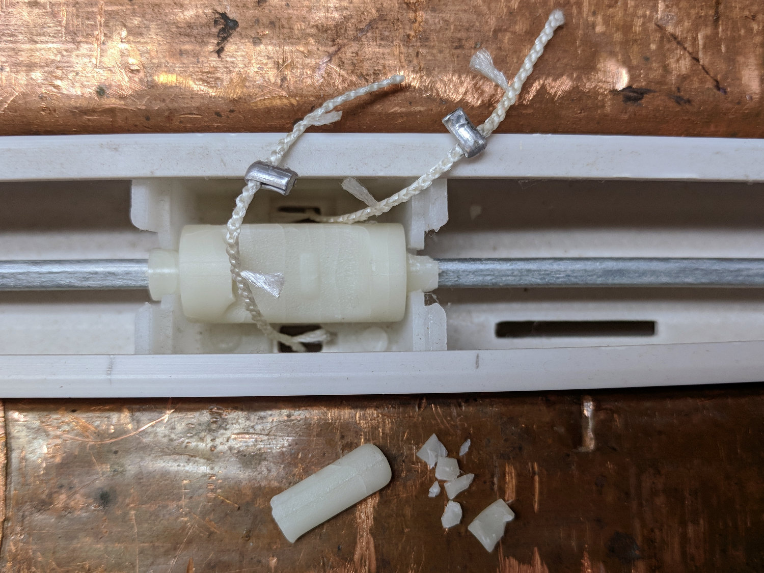 Two days after I reinstalled the miniblind, a second roller broke and was restored by a similar treatment. While I had the thing on the bench clamped in the bench vise, I preemptively slobbered epoxy on the intact roller in the hope of reinforcing it.