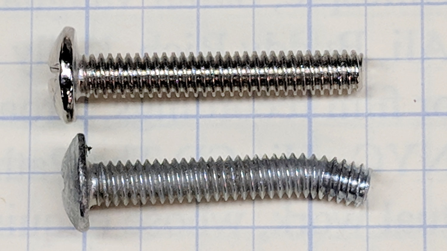 With that much of a bend in the screw, the knob left a nasty divot in the drawer front requiring a layer of wood-filled epoxy: