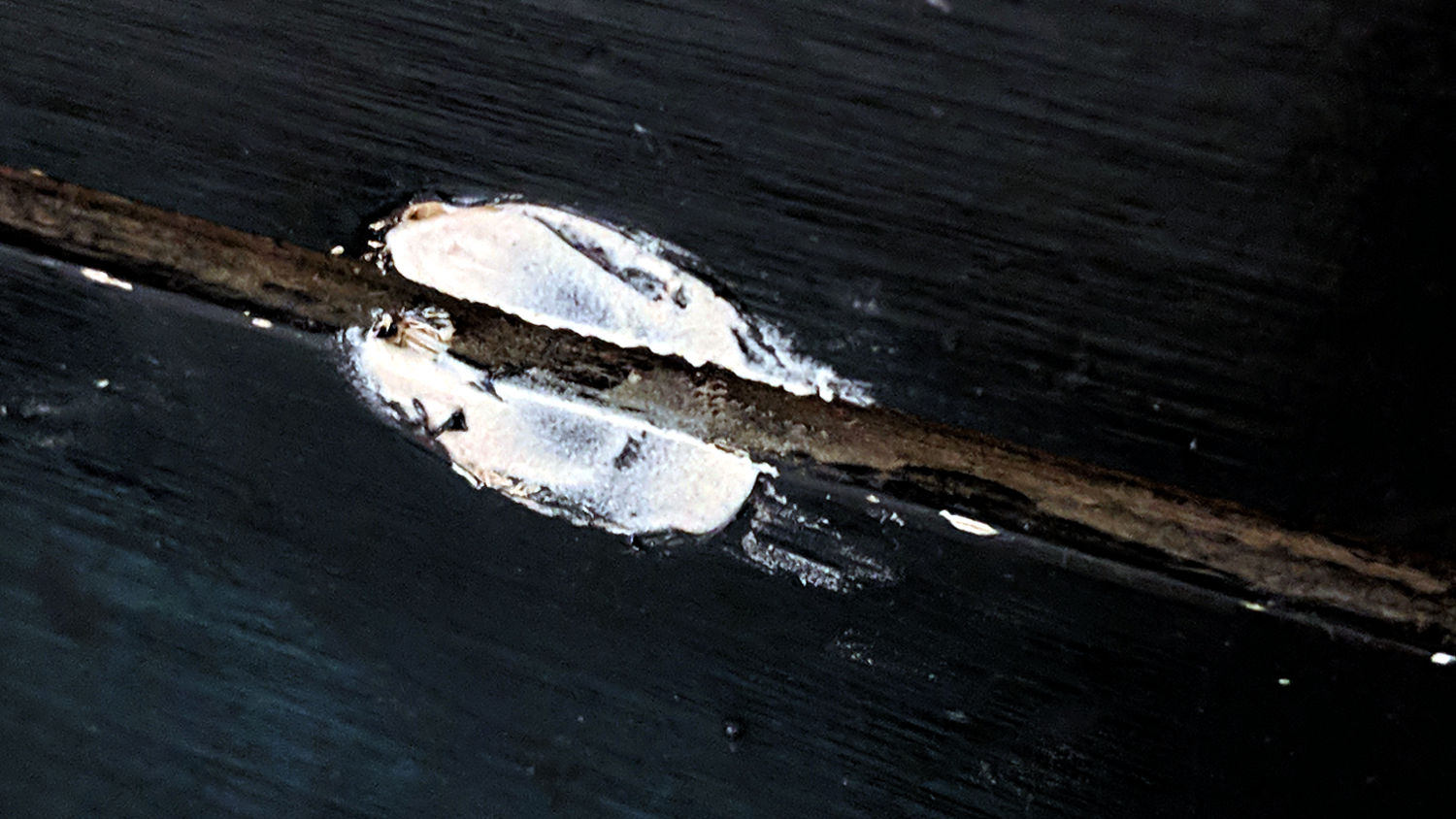 Despite appearances, only about 1/8 inch of the epoxy peeked around the knob, so I painted it black with a Sharpie, ran the knob onto the screw, and declared victory: