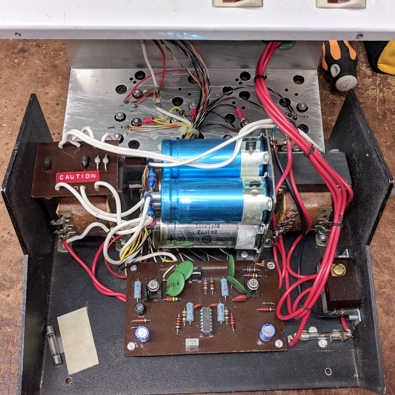 The components come from the mid-70s and the shop happened around 1980, so it’s been ticking along for nigh onto four decades. Of late, the supply voltages became erratic and I eventually popped the top: