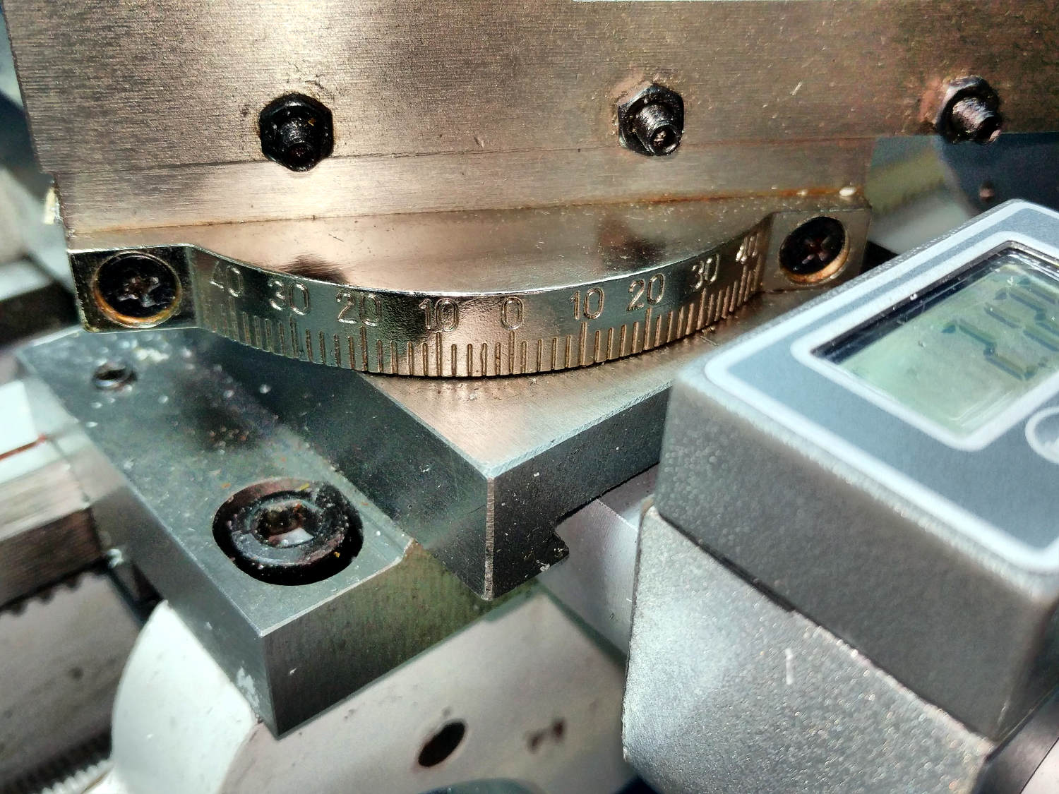 The little wedge of daylight near the gauge pivot is the difference between the normal perpendicular-to-the-spindle axis setting and half-a-degree-ish.