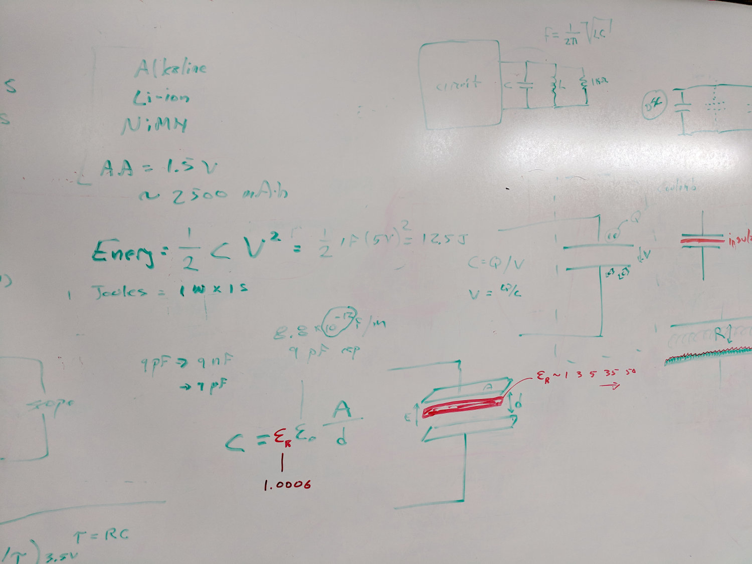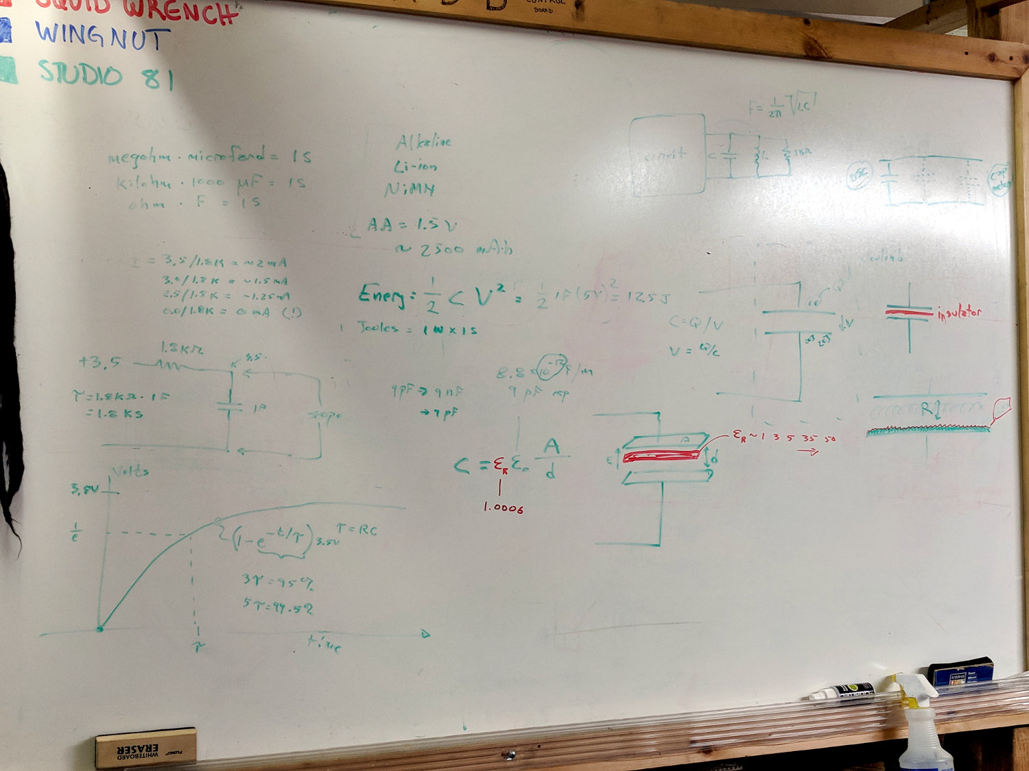 A 1 F cap charged through a 1.8 kΩ resistor during most of the session to show what an 1800 s time constant looked like. Nope, it never quite got to the 3.5 V from the power supply, even when we all decided it was time to shut down!