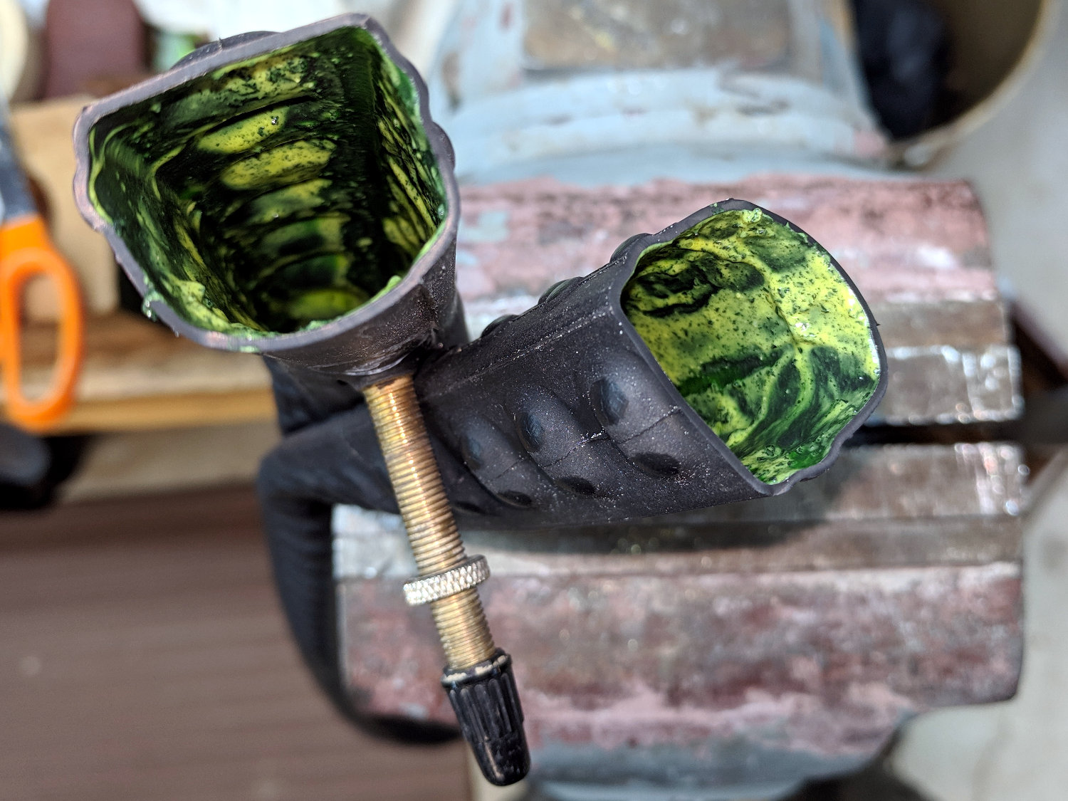 Cutting it open reveals the perfectly good greenish-yellow sealant: