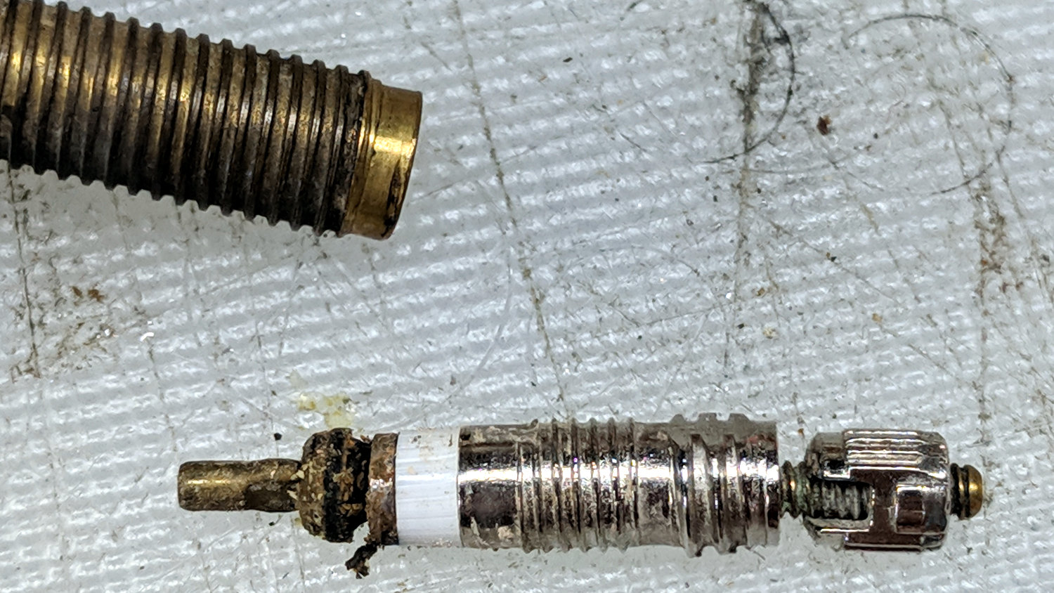 Dismantling the Presta valve stem show the rubbery crud on and around the valve seal and seat: