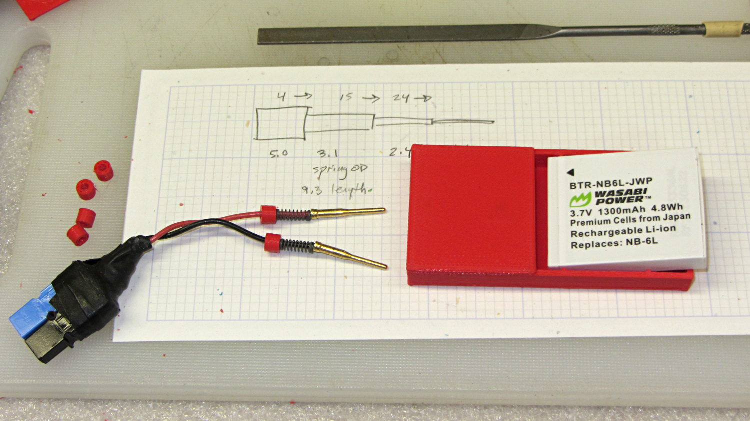 The original camera battery test fixtures used contact pins conjured from hulking gold-plated connector pins and coil springs: