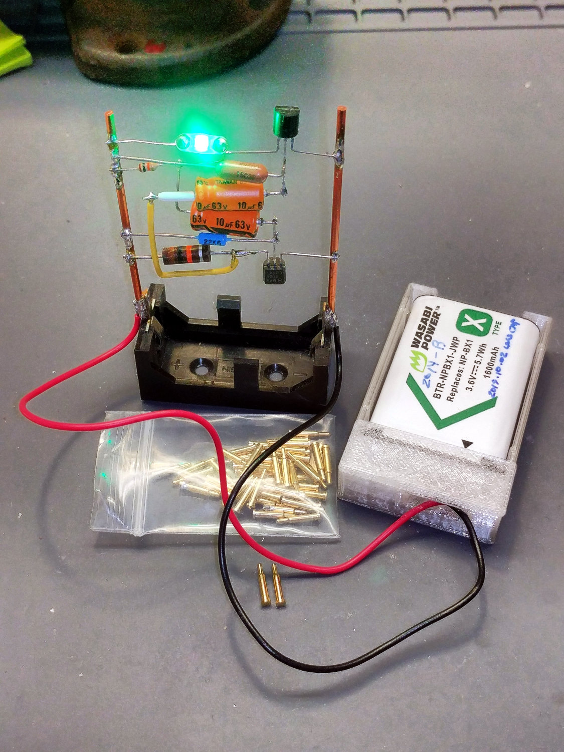 That’s the long-suffering astable multivibrator, still soldered to its CR123A holder.