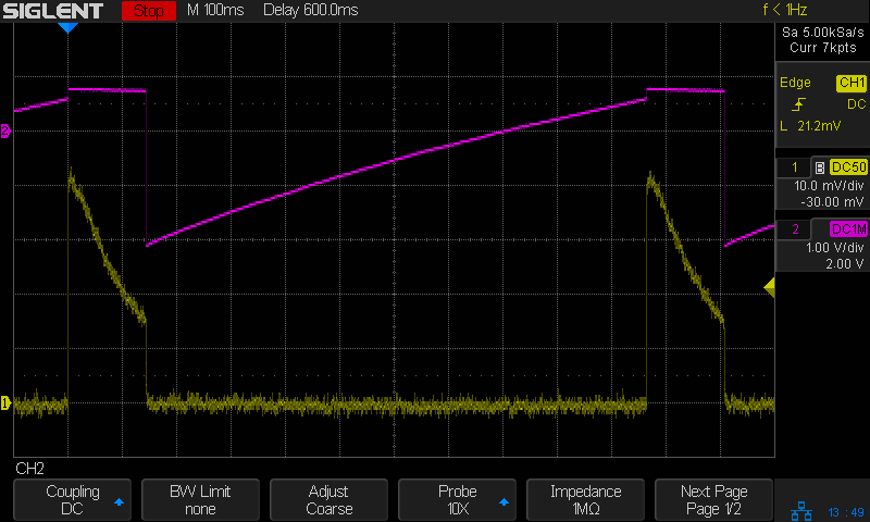 The current trace is at 100 mA/div: the pulse starts at 400 mA, which seems excessive even to me, and tapers down to 200 mA. It’s still an order of magnitude too high at the end of the pulse.