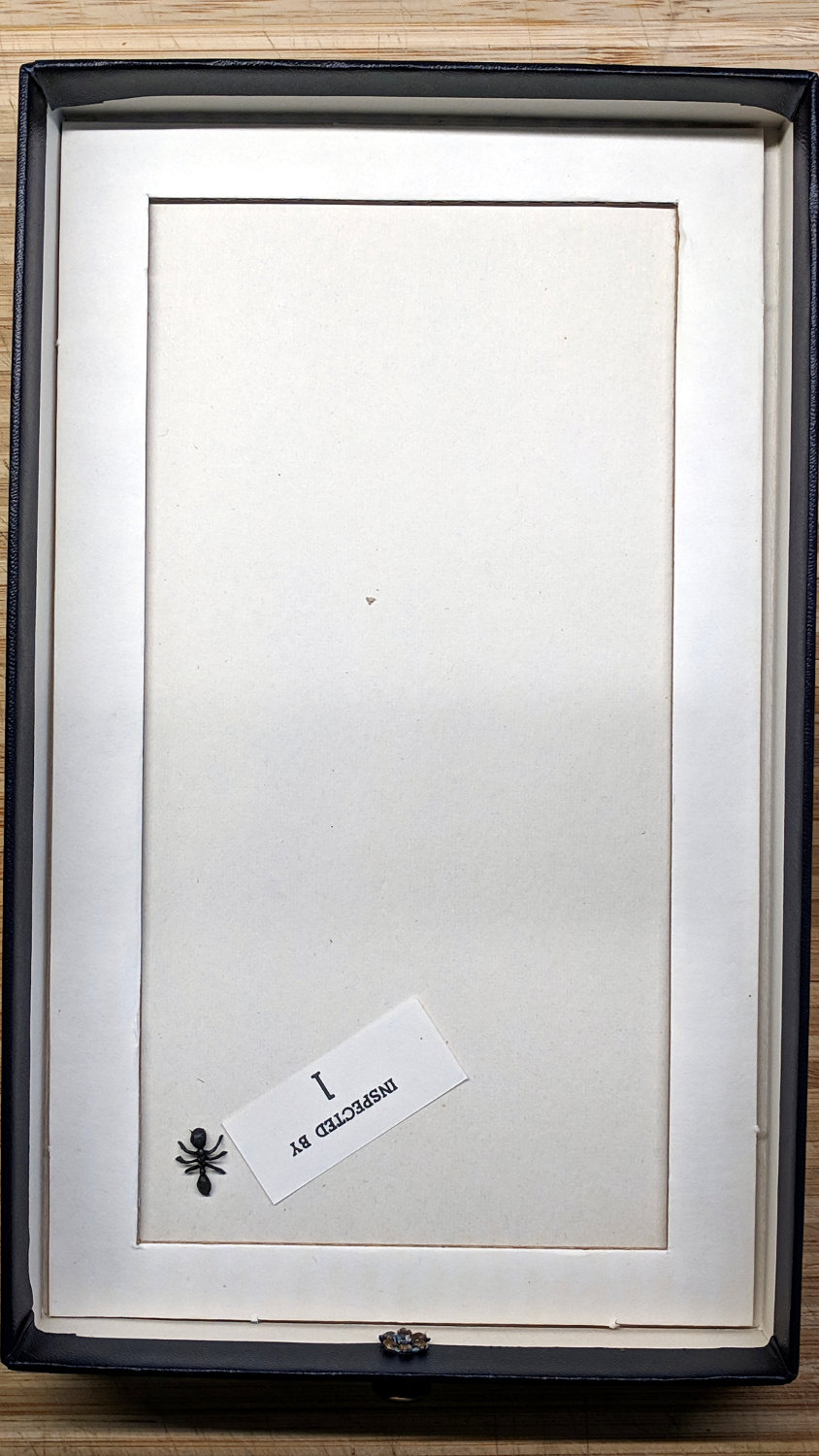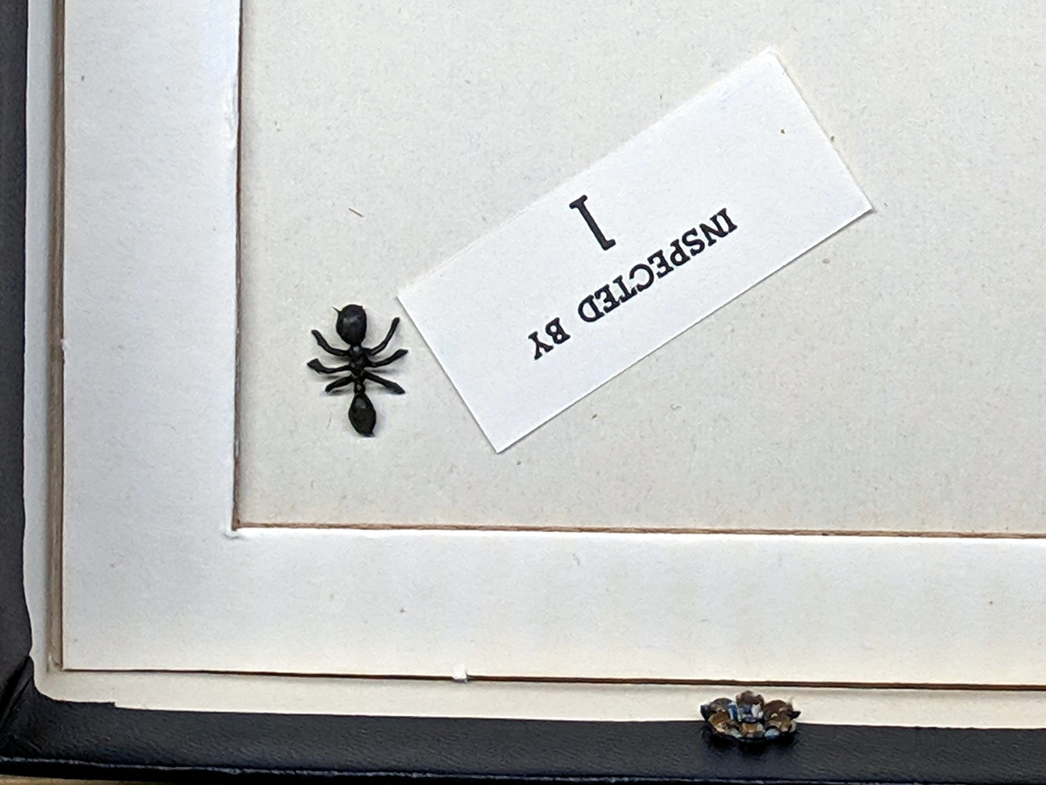 It’s a plastic ant from a bag in the Kiddie Surplus box my Shop Assistant grew up with and a pleasant reminder of long-ago days, carefully placed where only I’d ever see it.