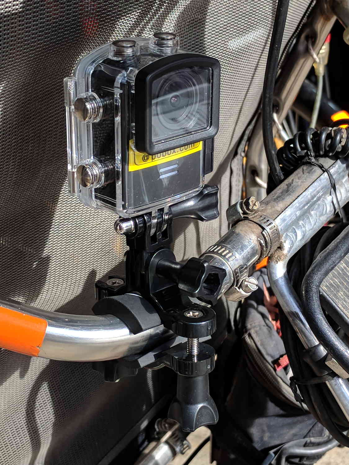 Contrary to the first picture, I later remounted the camera under the seat rail with its top side downward. The M20 has a “rotate video” mode for exactly that situation, which I forgot to turn off in the fancy new mount, so I rotated the pix afterward.