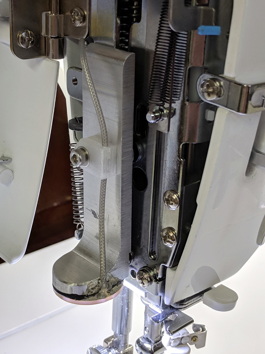 I’ve devoted plenty of hours to watching mechanical doodads as I turn the main shaft by hand, because there’s absolutely no clearance in some spots: routing the wire from the needle LEDs through the slot over the presser foot lift lever just barely misses a few moving parts.