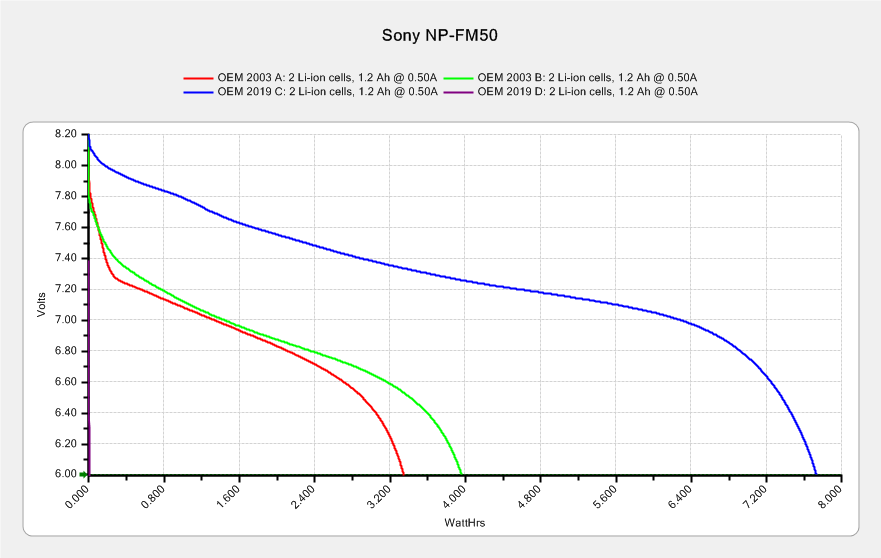 The red and green traces come from the two batteries I’ve been cycling through the camera since, um, 2003, so they’re getting on in years and correspondingly low in capacity.