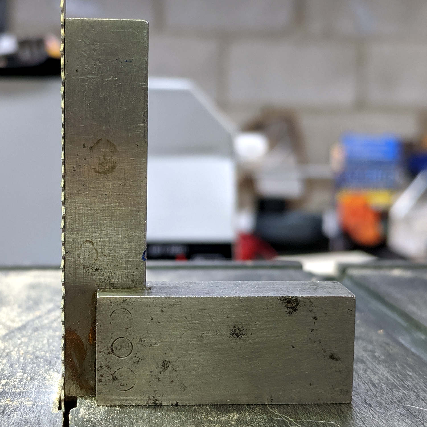 Mostly, the Tiny Bandsaw™ cuts thin sheets, where having the blade at a slight angle off perpendicular doesn’t make much difference. I recently started to cut a thicker block and thought the blade looked a bit slanted, so I deployed the Tiny Square™ to set it properly: