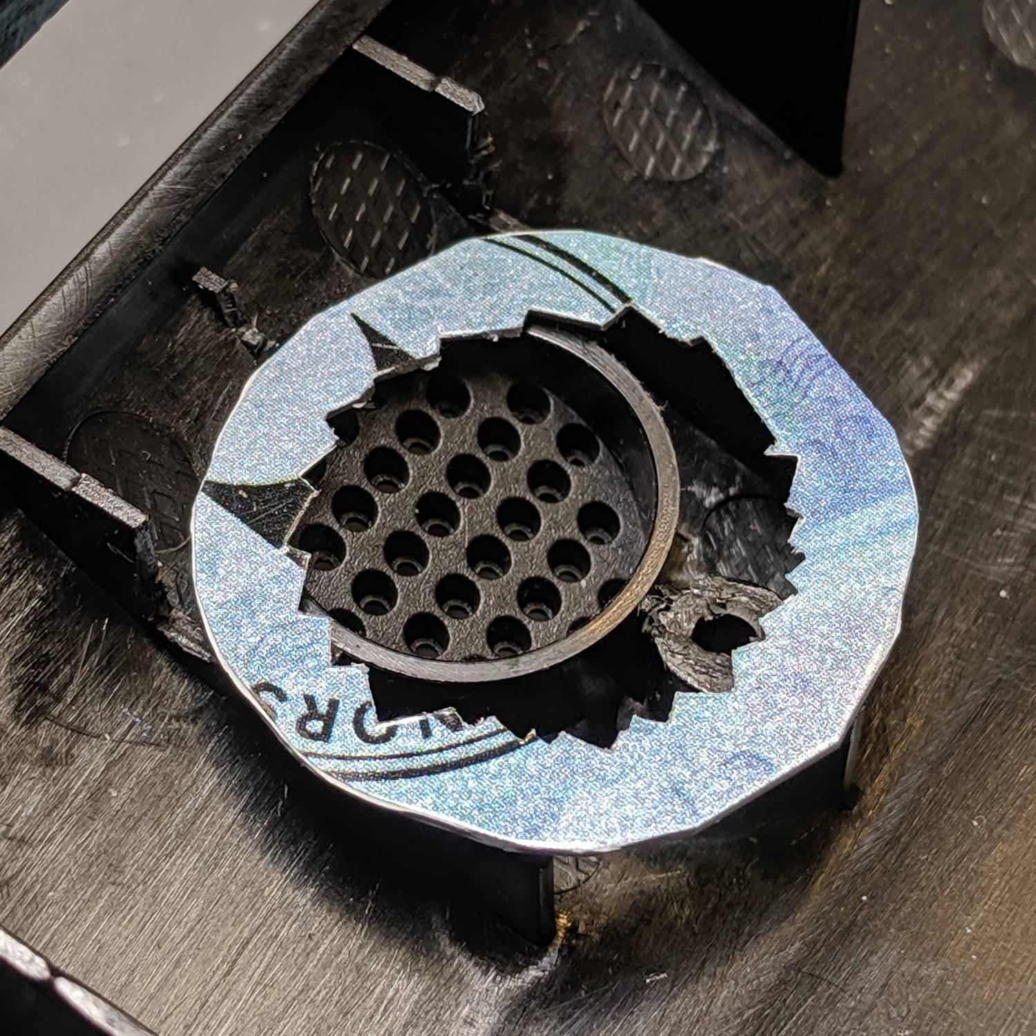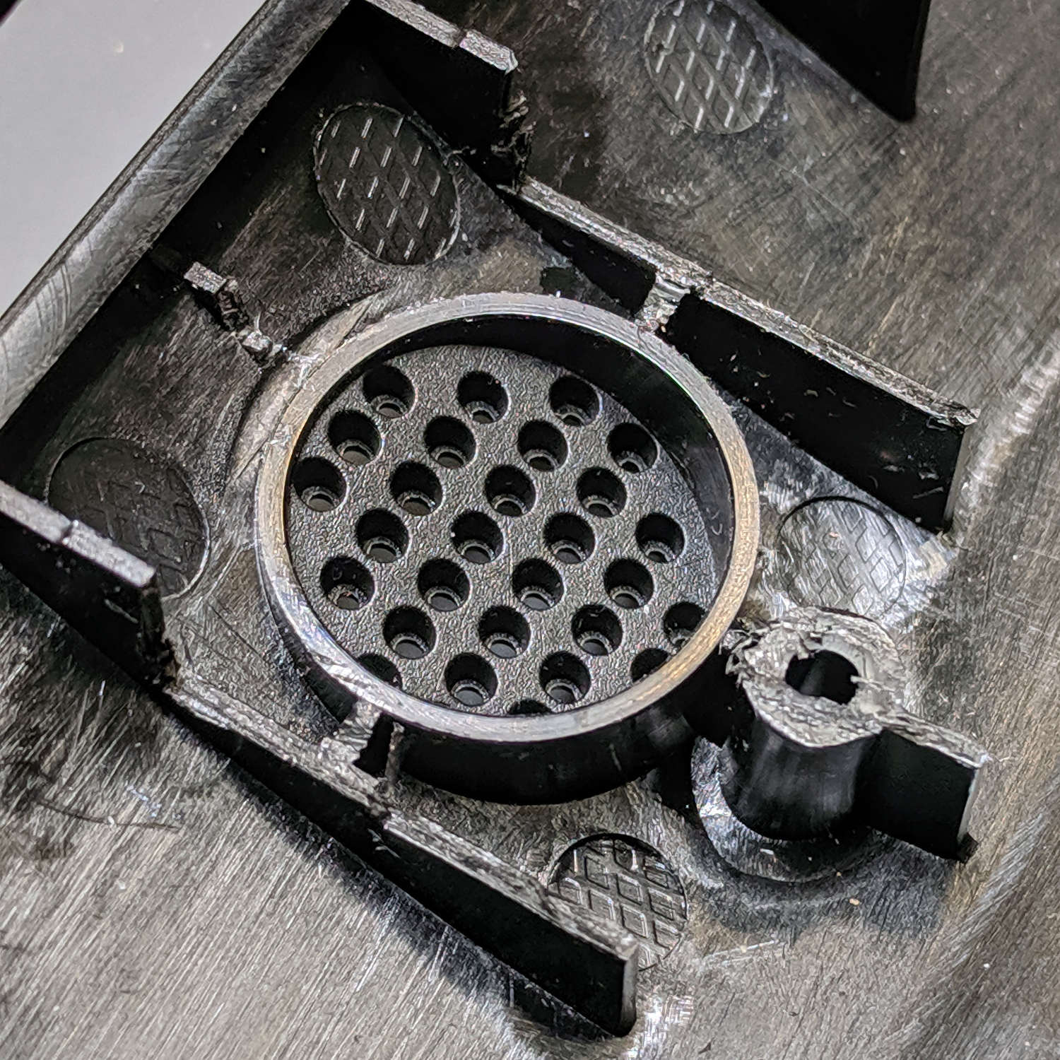 I don’t happen to have a tiny 8 Ω speaker, but I do have a bunch of small speakers (Update: 28 mm OD), so I bulldozed those walls with a flush cutting pliers and a bit of cussing to make room: