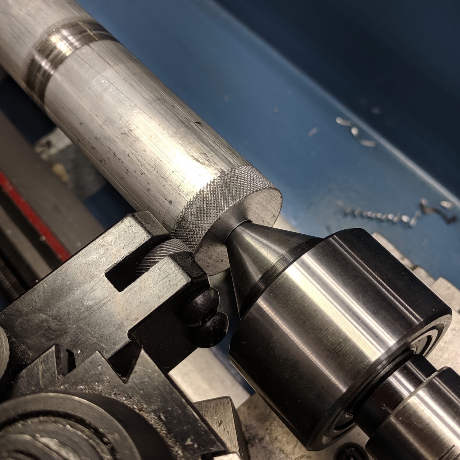 For some unknown reason, it seemed like a Good Idea to knurl without the steady rest, perhaps to avoid deepening the ring where the jaws slide, but Tiny Lathe™ definitely wasn’t up to the challenge. The knurling wheels aren’t quite concentric on their bores and their shafts have plenty of play, so I got to watch the big live center and tailstock wobbulate as the rod turned.