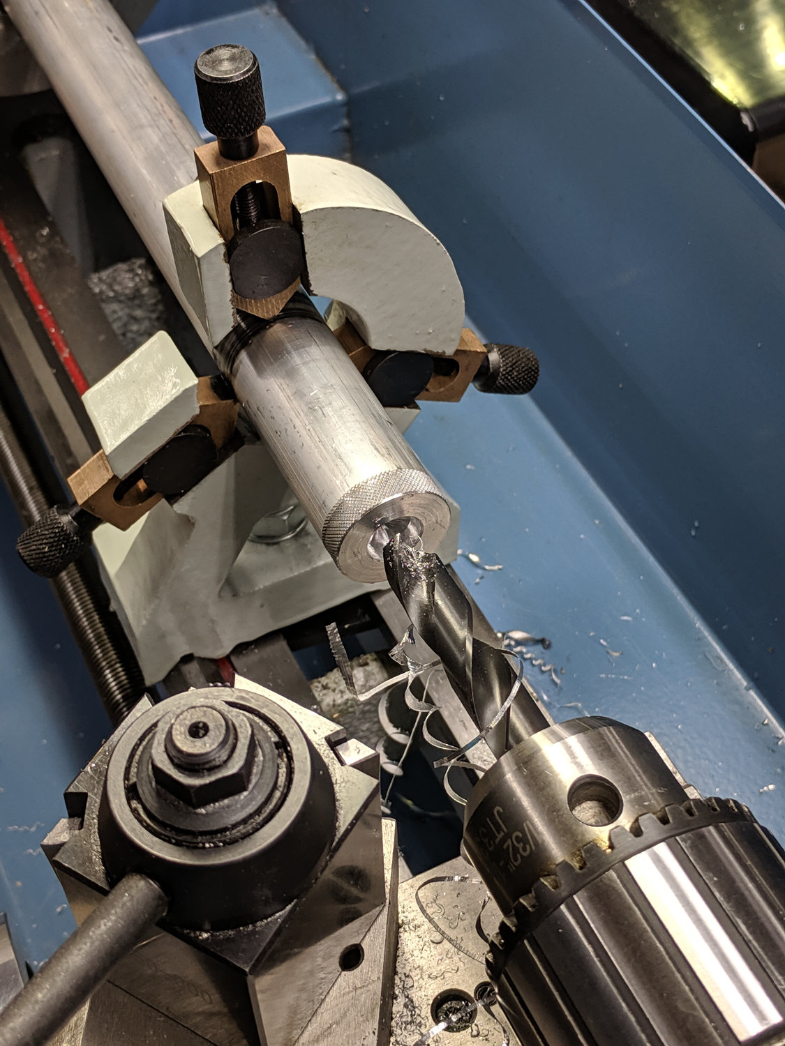 With the steady rest back in place, drill out the rod to match the shaft’s 12 mm OD: