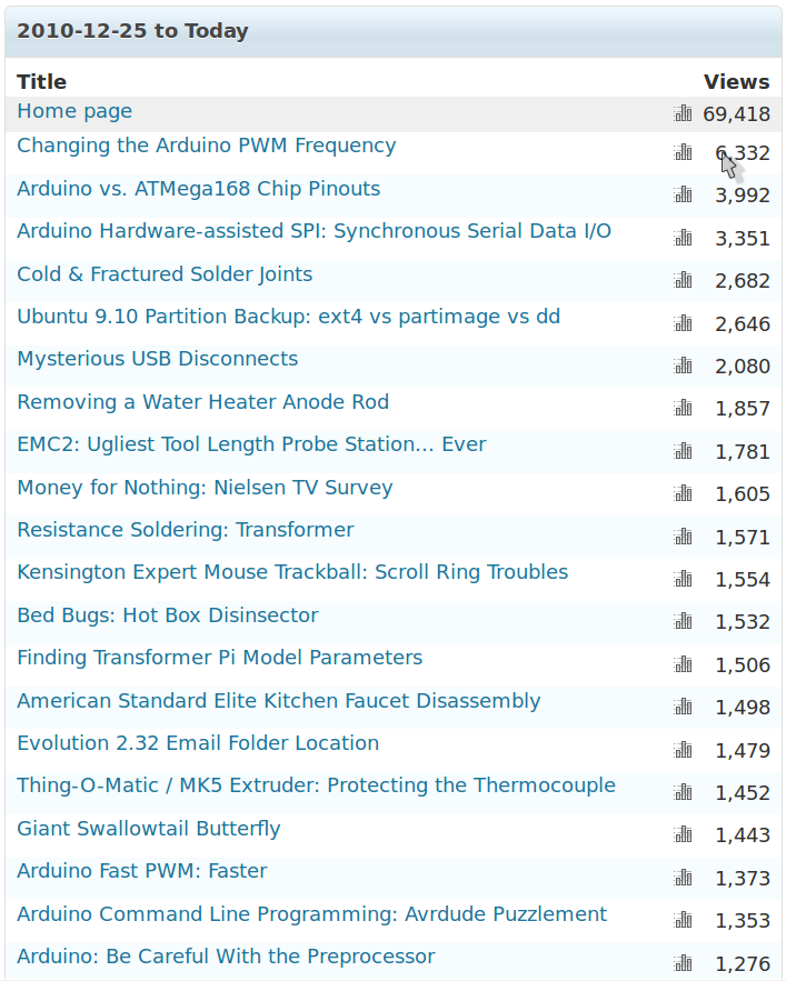 Despite having no publicity, the site gets about 850 views per day: half from search engines, a third from RSS, and the rest from folks rattling around inside. Not much by commercial standards, but I’m pleased you’re interested enough to stop by…