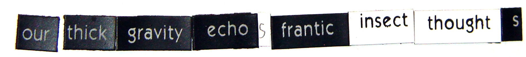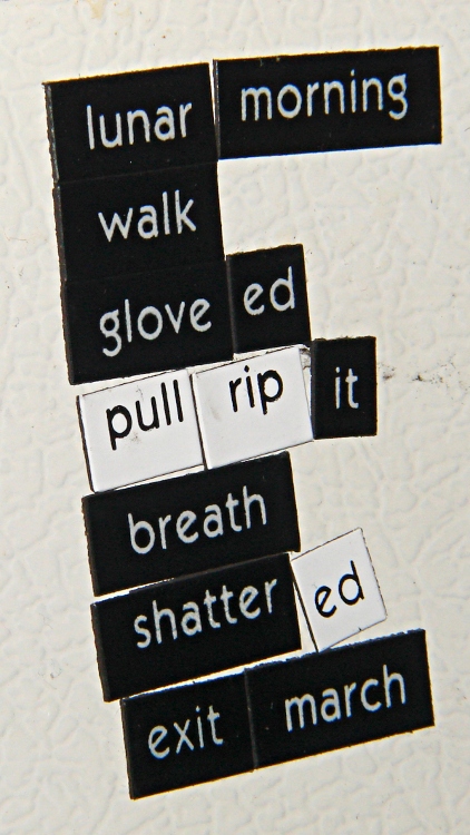 Some years ago I picked up three different magnetic word assortments for the refrigerator, spread them out, and watched insights emerge as my Shop Assistant and I rearranged them. Now that she’s a Larval Engineer, their quantum states have collapsed and I can extract some Subconscious Wisdom…