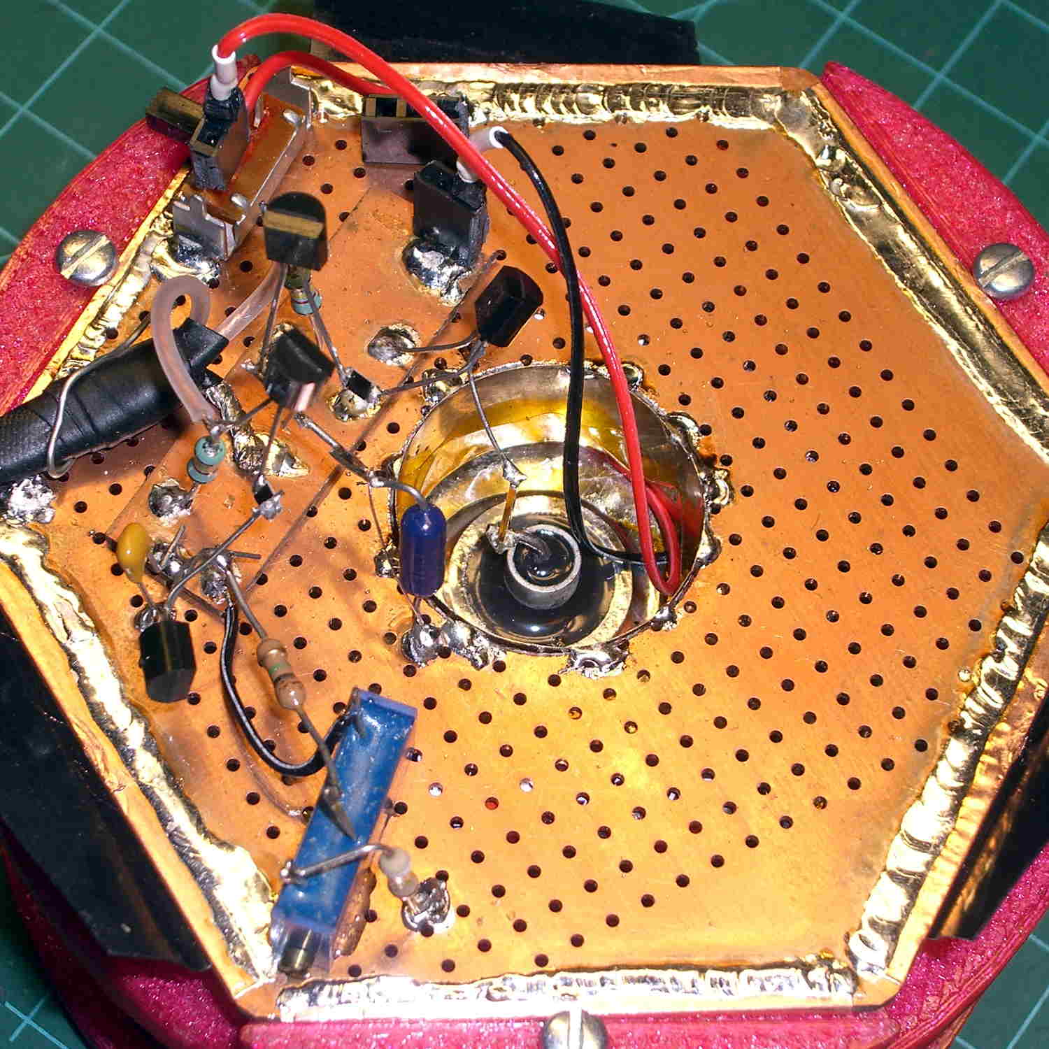 The blue trimpot in the foreground drives the base of a duplicate pair of transistors in a misguided attempt to make a differential amp that would balance out some thermal effects. Turned out to be not worth the effort, due to the adjustment’s fiddly nature, but also not worth unsoldering the parts.
