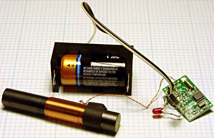 Basically, you get the receiver and CR123 cell holder from DigiKey for maybe fifteen bucks. Wire up a FET (ZVNL110A or some such) to the receiver’s inverted-polarity output, so the LED is ON during the data bit’s active time (carrier drops 10 dB). I blobbed on a 300 ohm SMD resistor, so the total current is maybe 250 µA with the LED on. If you’re going crude, you can probably wire the LED & resistor directly to the receiver’s positive-polarity output.