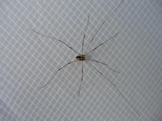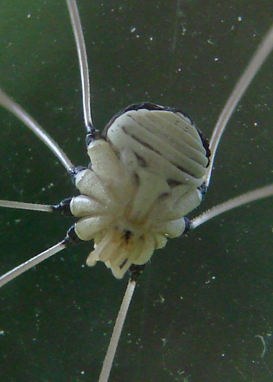 Then I found another Harvestman on a window when we got home. Not having seen the underside of one in quite a while, I was struck by the “alien face” pattern. I suppose the reddish dot under the alien’s nose is the Harvestman’s mouth, just like it looks.